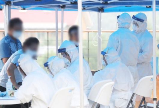 오늘부터 서울과 경기지역에 대한 ‘사회적 거리두기’ 2단계 격상에 따른 조치가 시행된다. 경기도의 한 마을회관에 설치된 임시선별진료소에서 의료진이 분주하게 움직이고 있다. 연합뉴스 |