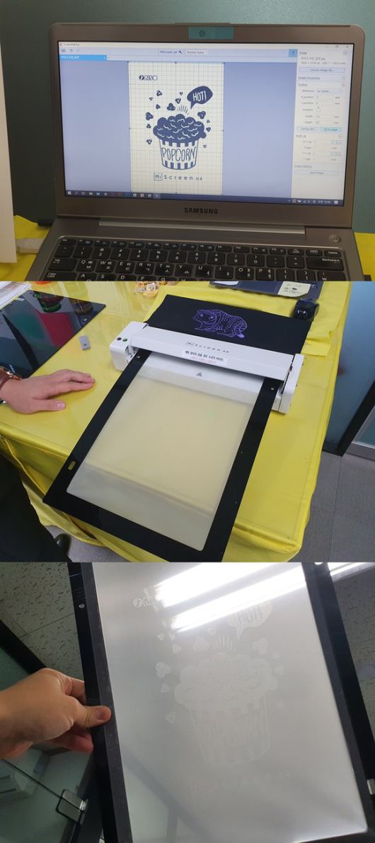 스크린 제판 과정은 모니터에 출력된 이미지를 프린터로 뽑는 일반 인쇄 방식과 동일했다. 용지 역할의 스크린마스터(실크망)을 프레임에 고정시킨 후 PC에서 직접 제작한 디자인을 띄워 인쇄 버튼을 누르면 끝이다. 일반 A4용지를 뽑을 때처럼 2쪽,4쪽 등 모아찍기도 가능하다. 출력된 스크린마스터를 기기에 고정해 커버 스위치를 손으로 꾹 누르고 있으면 래쪽으로 넣은 프레임이 조금씩 위쪽으로 인쇄되면서 제판이 된다. 약 35초면 하나의 인쇄판이 만들어진다.