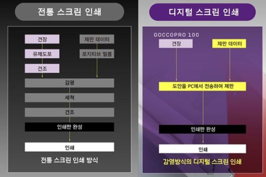 전통적 스크린 인쇄방식에서 원하는 디자인이 담긴 판을 제작하려면 '디자인 도안→포지티브 필름 출력→프레임에 실크망사 견착→유제 도포→망 건조→실크망 노광(감광) 공정→망 물세척→건조→스크린망(인쇄판) 완성→인쇄'라는 9단계 과정을 거친다. 과정이 복잡할 뿐 아니라 암실과 배수 시설도 갖춰야 했다. 디지털 스크린 제판기는 기존 9단계 과정을 4단계로 줄였다. 특히 감광과 세척,건조 등의 과정을 없애 공간 제한성을 크게 낮췄다.