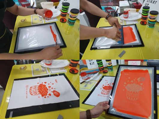 자연건조보다는 열풍기(히팅건)을 권장하고 있다. 수성잉크로 찍어내 완전한 건조를 거치면 세탁을 해도 잘 지워지지 않는다. '디자인 도안→프레임에 스크린마스터 견착→PC에서 도안 전송해 스크린망(인쇄판) 제판→인쇄'의 단축된 과정으로 '나만의 굿즈'가 완성됐다.