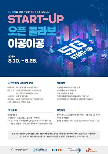 (대전=연합뉴스) 박주영 기자 = 연구개발특구진흥재단은 대전창조경제혁신센터, 에트리홀딩스, 한국전자통신연구원(ETRI), SKT와 공동으로 5G 분야 스타트업을 지원하는 '스타트업 오픈 콜라보 이공이공'을 추진한다고 18일 밝혔다.