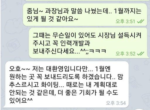 이후 A씨는 담당 과장과 면담을 마친 오후 3시51분께 상사에게 다시 연락해 "과장님과 말씀 나눴는데, 1월까지는 있게 될 것 같아요"라며 "그때는 무슨 일이 있어도 시장님 설득시켜 주시고 꼭 인력개발과 보내주신다세요"라고 전했다. 이에 상사는 "대환영입니다"라면서 "1월엔 원하는 곳 꼭 보내드리도록 하겠습니다. 맘 추스르시고 화이팅"이라고 답했다.