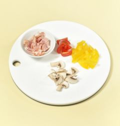달걀 2개, 소금ㆍ후춧가루 적당량씩, 양송이버섯 1개, 햄ㆍ토마토ㆍ파프리카 약간씩, 올리브오일 적당량, 모차렐라 치즈 (슬라이스) 1장