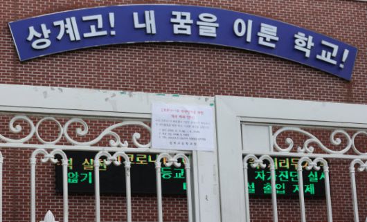 (사진=연합뉴스)18일 오후 서울 노원구 상계고등학교 정문에 코로나19 확산방지를 위한 학교 폐쇄 안내문이 붙어있다. |