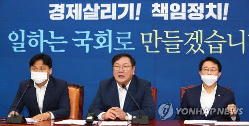 김태년 원내대표는 이날 원내대책회의에서 "통합당은 8·15 집회를 사실상 방조한 것에 대해 국민 앞에 사과해야 한다"고 밝혔다.