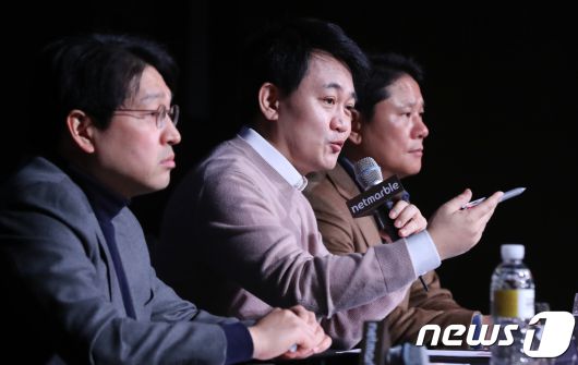 방준혁 넷마블게임즈 의장(가운데)이 6일 오전 서울 신도림쉐라톤 디큐브시티 호텔에서 열린 넷마블 기자간담회에서 올해 사업 목표를 발표하고 있다. 왼쪽부터 넷마블 백영훈 부사장, 방 의장, 권영식 대표. 2018.2.6/뉴스1 © News1 구윤성 기자 |
