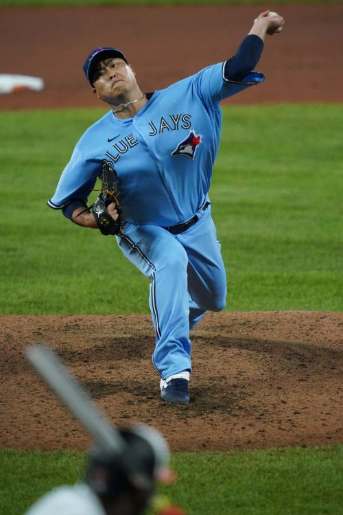 미국프로야구 메이저리그(MLB) 토론토 블루제이스 류현진이 18일(한국시간) 미 메릴랜드 주 볼티모어 오리올 파크 앳 캠든야즈에서 열린 볼티모어 오리올스와의 경기에 선발 등판해 6회 투구하고 있다. 볼티모어 | USA투데이 스포츠 연합뉴스 |