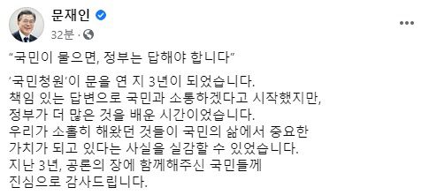 (서울=연합뉴스) 박경준 기자 = 문재인 대통령은 청와대 국민청원 게시판 개설 3주년인 19일 국민청원 게시판을 통해 청원에 참여해 준 국민에게 감사의 뜻을 전했다.