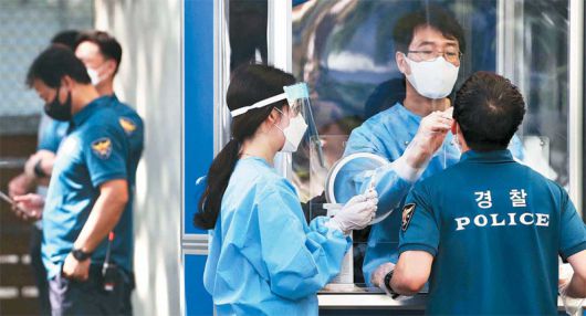 지난 15일 서울 광화문 집회 현장에서 질서 유지를 담당했던 경찰 관계자들이 19일 서울 중구 서울지방경찰청 기동본부에 마련된 선별진료소에서 코로나19 검사를 받고 있다. 15일 집회엔 14개 지방청 소속 90여 개 중대 7613명이 배치돼 현장을 관리했다. [한주형 기자] |