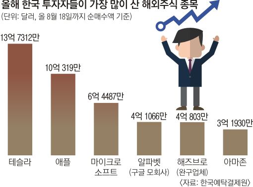 실제로 올 1월부터 8월 18일까지 순매수액 기준으로 한국 투자자들이 가장 많이 사들인 주식은 테슬라(13억 7312만 달러)였다. 비대면 수혜주로 꼽히는 애플(10억 319만 달러), 마이크로소프트(6억 4487만 달러), 구글의 모회사인 알파벳(4억 1066만 달러), 미국 완구업체인 해즈브로(4억 803만 달러), 아마존(3억 1930만 달러) 등이 순위에 이름을 올렸다.