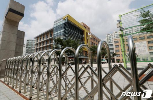 18일 사랑제일교회 소재지인 서울 성북구의 한 초등학교가 이날로 예정됐던 개학을 미루고 원격수업으로 전환해 교문이 닫혀 있다. /사진=뉴스1 |