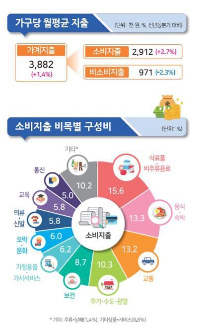 주거·수도·광열 지출은 29만9000원으로 6.9% 증가했다. 월세 등 실제주거비는 1.8% 감소했지만 주택유지 및 수선과 주거용 연료비 지출이 각각 35.9%, 7.3% 증가했다.