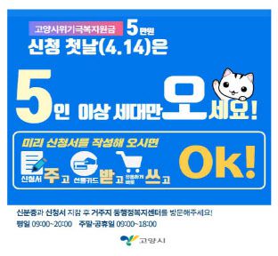 당시 고양시는 14일부터 시에서 지급하는 재난지원금 신청을 받는다는 계획이었는데 창구의 혼잡을 막기 위해 첫날은 5인 이상 세대에 한정해 협장접수를 하기로 했다. 이에 따라 ‘5인 이상 세대만 오라’는 안내문을 제작해 고양시 홈페이지나 SNS 등에 게시하고 홍보했다.