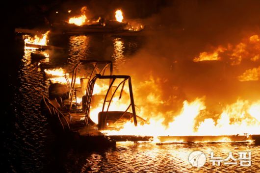![[캘리포니아 로이터=뉴스핌] 김선미 기자 = 폭염에 시달리고 있는 미국 캘리포니아주 북부 일대에서 번개가 대형 산불로 번지는 이른바 'LNU 번개 복합 화재(LNU Lightning Complex)'가 발생한 가운데, 나파 카운티 외곽에 위치한 마클리코브 리조트 인근 선창에 정박해 있던 보트들이 불에 타고 있다. 2020.08.20 gong@newspim.com](https://thumb.zumst.com/530x0/https://static.news.zumst.com/images/52/2020/08/20/226fb240c3cc4fed800aa24cb32bf114.jpg) | [캘리포니아 로이터=뉴스핌] 김선미 기자 = 폭염에 시달리고 있는 미국 캘리포니아주 북부 일대에서 번개가 대형 산불로 번지는 이른바 'LNU 번개 복합 화재(LNU Lightning Complex)'가 발생한 가운데, 나파 카운티 외곽에 위치한 마클리코브 리조트 인근 선창에 정박해 있던 보트들이 불에 타고 있다. 2020.08.20 gong@newspim.com |