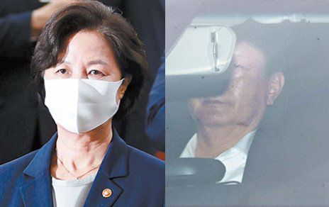 지난 3일 경기 과천시 정부과천청사에서 열린 신임 검사 임관식에 참석한 추미애 법무부 장관(왼쪽 사진)과 같은 날 차를 타고 대검찰청을 나서는 윤석열 검찰총장. [연합뉴스] |