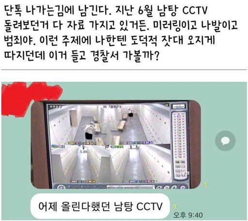해당 단톡방에 있던 것으로 보이는 인물은 “단톡 나가는 김에 (글을) 남긴다”면서 “지난 6월 남탕 CCTV 돌려보던 거 자료 다 가지고 있다. 미러링이 아닌 범죄다”라고 주장했다.