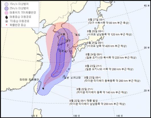 태풍의 다음주 중반 우리나라에 영향을 미칠 전망이다. 현재로썬 26일 오후나 밤사이 남해안에 상륙해 내륙을 지날 확률이 가장 높다. 27일 오전 8시 태풍은 대구 서북서쪽 약 80㎞ 육상에 위치할 것으로 기상청은 보고 있다.