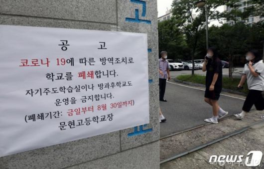 (서울=뉴스1) 황기선 기자 = 신종코로나바이러스(코로나19) 확진자가 큰 폭으로 늘어나고 있는 가운데 20일 오전 서울 송파구 문현고등학교에 폐쇄를 알리는 안내문이 걸려있다. 확진자가 발생한 문현고는 이날 교내 강당에 선별진료소를 설치해 검사를 실시했다. 2020.8.20/뉴스1 |