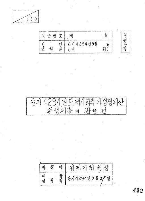 4차 추경안은 언제 편성돼 제출됐을까요? 바로 ‘단기4294년 9월 29일’입니다. 1961년까지 정부 문서에는 연도 표기를 단기로 했답니다. 단기4294년이 서기 1961년입니다. 5·16 군사정변 이후에 4차 추경이 편성된 것이지요. 이듬해인 1962년 추경안을 찾아보면 이때부터는 공문서의 연도 표기가 단기가 아닌 ‘서기’로 바뀌는 것을 살펴볼 수 있습니다.