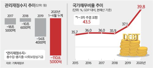 이미 재정건전성 지표에는 ‘빨간불’이 켜진 상태다. 3차 추경 기준 통합재정수지(총수입-총지출) 적자는 국내총생산(GDP)의 3.9%(76조2000억원)에 달하고, 관리재정수지(통합재정수지-사회보장성기금) 적자는 GDP의 5.8%(111조5000억원) 수준으로 급증했다. 국가채무도 GDP의 43.5%로 사상 최고치로 치솟았다. 코로나19 충격으로 올해 우리 경제가 역성장을 기록할 것이란 전망이 쏟아지는 가운데 내년에도 수십조원의 적자국채가 발행된다면 GDP 대비 국가채무비율은 50%에 근접할 수 있다.