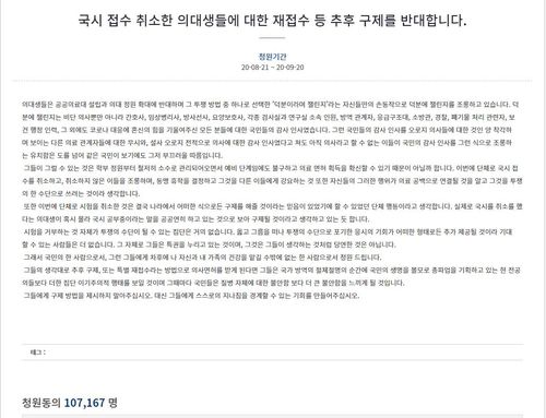 '국민의 한 사람이자 미래 의사들에게 내 가족의 건강을 맡길 수밖에 없는 사람'이라고 자신을 밝힌 작성자는 '국시 접수 취소한 의대생들에 대한 재접수 등 추후 구제를 반대합니다'라는 제목의 청원을 이달 21일 올렸다.