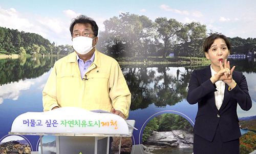 24일 이상천 제천시장이 긴급재난지원금 지급 등을 알리는 비대면 온라인 브리핑을 하고 있다. 제천시 제공 |
