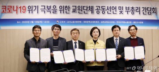 유은혜 사회부총리 겸 교육부 장관, 교원단체 관계자들이 지난 3월 19일 오후 서울 영등포구 여의도 교육시설재난공제회에서 열린 '코로나19 위기 극복을 위한 교원단체 공동선언 및 부총리 간담회'에 참석해 기념촬영을 하고 있다.기사내용과 무관./사진=김휘선 기자 |