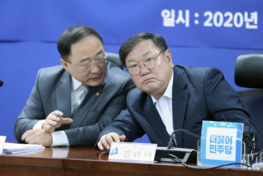 더불어민주당 김태년 원내대표(오른쪽)와 홍남기 경제부총리(왼쪽)가 지난 4일 오전 서울 여의도 국회 의원회관에서 열린 부동산 시장 안정화를 위한 주택공급 확대방안 당정 협의에서 대화하고 있다. /연합뉴스 |