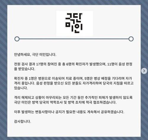 24일 극단 미인 측은 공식 인스타그램에 "전원 검사 결과 17명의 참여진 중 총 6명의 확진자가 발생했으며, 11명이 음성 판정을 받았다"라고 전했다.