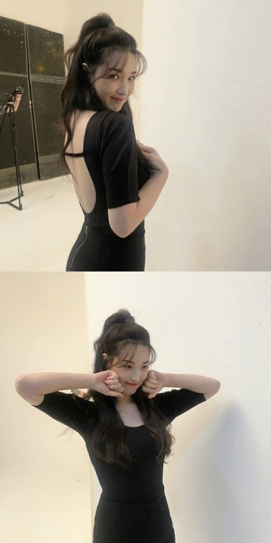 이날 공개된 사진 속 율희는 높게 묶은 반올림 헤어 스타일에 블랙 컬러 원피스를 입은 채 포즈를 취하고 있다. 특히 과감하게 등이 파여 있는 디자인이 눈길을 사로잡는다. 여기에 애 엄마라고는 믿기지 않는 잘록한 허리가 감탄을 불러일으킨다.