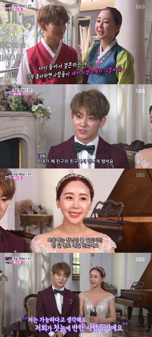 2018.04 SBS ‘본격연예 한밤’에서 함소원과 18살 연하의 남편 진화와의 웨딩촬영 현장을 공개. 진화는 함소원에 대해 첫 만남에 반했다고 얘기했다.(사진=SBS)
