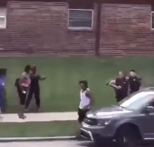 경찰이 총을 쏜 후 한 여성이 다가와 팔짝팔짝 뛰고 있는 모습 |