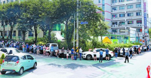 24일 인천시 서구보건소에 마련된 선별진료소에서 시민들이 코로나19 검사를 받기 위해 줄지어 서 있다. 이날 오전까지 인천시 서구청 소속 공무원 4명이 코로나19 추가 확진 판정을 받았다. [뉴시스] |