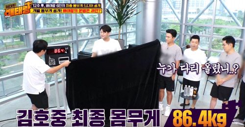 긴장된 표정으로 체중계에 올라선 김호중은 살짝 공개한 소수점 밑에 자리 숫자가 6이 나오자 바로 “쳐야지, 쳐야지”라며 검은 가림천으로 몸을 가린 뒤 바지를 벗고 다시 체중계에 올랐다.