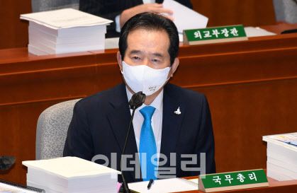 정세균 국무총리가 25일 국회 예산결산특별위원회 전체회의에서 의원들의 질의에 답변하고 있다. 노진환 기자. |