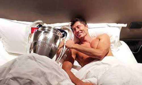 독일 분데스리가 바이에른 뮌헨 스트라이커 로베르토 레반도프스키(32)가 25일 자신의 사회관계망서비스(SNS)에 유럽축구연맹 챔피언스리그(UCL) 우승 트로피인 ‘빅이어’와 달콤한 하룻밤을 보낸 코믹 사진을 올렸다. 그는 침대에서 ‘woke up like this(이렇게 깨어났어요)’라는 글과 함께 침대에서 상의를 탈의한 채 ‘빅이어’를 쥐고 환하게 웃는 사진을 공개했다. 이 대회 15골로 득점왕에 오른 레반도프스키는 뮌헨의 트레블(분데스리가·포칼·UCL 3관왕)과 득점왕 트레블에 오른 기쁨을 만끽하며 최고의 시즌을 마무리했다.