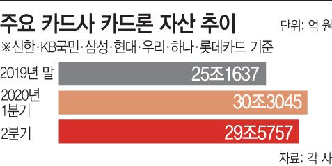 아시아투데이 최정아 기자 = 올 초 빠르게 증가하던 카드론이 2분기 들어 감소세로 돌아섰다. 1분기 30조원을 돌파했던 카드론 자산규모가 3개월 만에 2.4% 줄었다. 신종 코로나바이러스 감염증(코로나19) 확산 여파로 정부가 재난지원금, 저금리 대출상품 등 정책을 적극 활용해 자금 유동성을 크게 늘린 영향으로 풀이된다. 정책대출 상품을 이용해 보다 낮은 금리로 대출을 받거나, 카드론으로 급전을 마련하는 대신 재난지원금을 쓴 소비자들이 많았다는 얘기다. 대출 상환이 늘었다는 분석도 있다. 지난 3월 주식 투자 목적으로 카드론을 이용한 고객들이 빌렸던 돈을 대거 갚았을 것이란 분석이다.