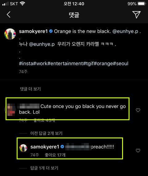 이를 본 한 네티즌이 "귀엽네. 흑인에게 한번 가면 다시 돌아오지 못한다"(Cute once you go black you never go back)는 댓글을 남겼고, 샘 오취리는 대댓글에 'preach'"라는 글을 남겼다.