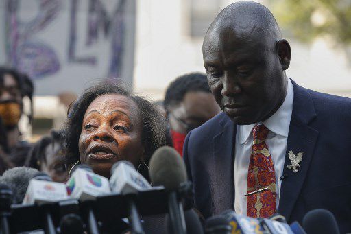 25일(현지시간) 제이컵 블레이크의 모친인 줄리아 잭슨(왼쪽), 벤 크럼프 변호사(오른쪽)이 미 위스콘신주 커노샤에서 열린 기자회견에 참석하고 있다. 블레이크는 지난 23일 자신의 세 아들이 보는 앞에서 커노샤 경찰에게 총격을 당해 중태에 빠진 상태다./사진=AFP |