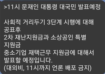 '11시 문재인 대통령 대국민 발표예정. 사회적 거리두기 3단계 시행에 대해 공표 후 2차 재난지원금과 소상공인 특별 지원금, 중소기업 재택근무 지원금에 대해서 발표할 예정입니다. 26일 오전 카카오톡과 각종 소셜네트워크서비스(SNS) 등에서 떠돌아다닌 확인되지 않은 내용의 지라시다. '대외비', '11시까지 언론 배포 금지' 등의 문구로 신빙성을 더하려고 노력한 이 지라시는 가짜뉴스였다.