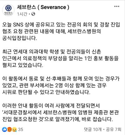 또 세브란스병원 측은 SNS을 통해 "최근 연세대 의과대학 학생 및 전공의들이 신촌 인근에서 의료정책의 부당성을 알리는 1인 홍보 활동을 펼치고 있는데 동료, 선후배들이 함께 모여 있는 경우가 있었다"며 "관련 부서에서는 2명 이상 함께 있는 경우 시위로 판단될 수 있다고 안내했고 이러한 안내 활동이 전달되면서 잘못 알려졌다"고 말했다.