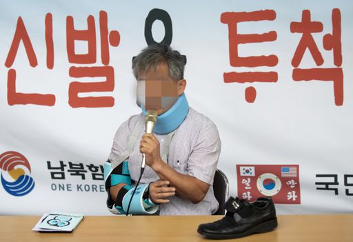 국회를 방문한 문재인 대통령을 향해 신발을 벗어 던진 정창옥 씨가 지난 20일 오후 서울 동화면세점 앞에서 시민과의 대화를 하고 있다. 연합뉴스 |