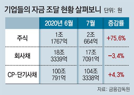 26일 금융감독원은 지난달 주식시장에서의 주식 발행규모는 2조664억 원에 이른다고 밝혔다. 올 6월보다 약 75%, 8900억 원가량 증가한 것이다. 지난달 이뤄진 유상증자는 총 9건으로 1조8241억 원어치가 발행됐다. 이는 3건에 그친 6월(3969억 원) 대비 359.6% 늘어난 규모다. 지난달 유상증자의 대부분은 신종 코로나바이러스 감염증(코로나19) 사태 등으로 채무 상환 부담이 커진 대한항공(1조1270억 원)과 CJ CGV(2209억 원) 등이 차지했다. 같은 기간 기업어음(CP)도 총 30조4099억 원이 발행되며 6월(25조1133억 원) 대비 21.1% 증가했다.