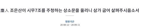 '진인 조은산이 시무 7조를 주청하는 상소문을 올리니 삼가 굽어살펴주시옵소서'라는 제목의 글에서 청원인은 정부의 부동산 정책을 겨냥해 "집값이 11억원이 오른 곳도 허다하거늘, 어느 대신은 현 시세 11%가 올랐다는 미친 소리를 지껄이고 있다"고 직격하는 등 정부 정책 전반을 거세게 비판했다.