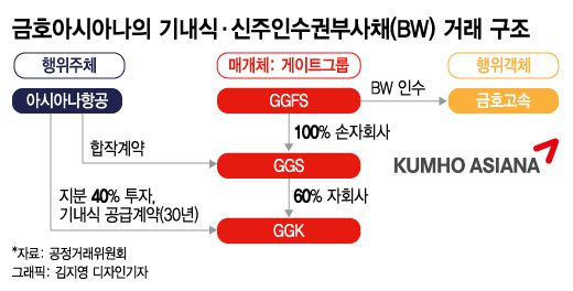 방법을 구체적으로 살펴보면, 아시아나항공은 우선 스위스 기업 게이트고메스위스(GGS)와 4대 6 비율로 게이트고메코리아(GGK)라는 기업을 설립했다. 이후 아시아나항공은 GGK에 기내식 공급 사업을 맡겼다. 뒤이어 GGS·GGK와 같은 그룹인 게이트그룹파이낸셜서비스(GGFS)가 총 1600억원에 달하는 금호고속의 신주인수권부사채(BW)를 무이자로 인수했다. BW는 발행회사 주식을 매입할 수 있는 권리가 부여된 사채다.