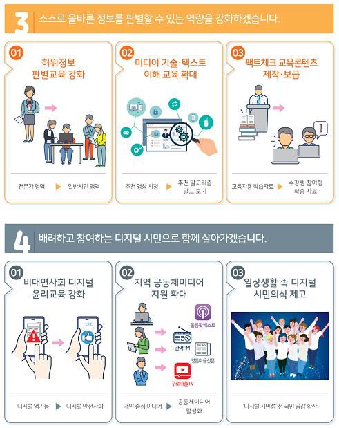 우선 국민이 직접 참여하는 팩트체크 오픈 플랫폼을 구축·운영하고 SNS·유튜브 등 알고리즘에 대한 이해 교육으로 디지털 콘텐츠 활용 능력을 높인다. 팩트체크 시민교육을 확대하고, 각 분야 전문가가 전문 팩트체커로 활동할 수 있도록 심화교육을 실시한다. 디지털 공간에서의 정체성 확립, 소통과 사회 참여 등을 위한 윤리교육을 강화하고, 사이버 폭력과 혐오표현 등 디지털 역기능 예방 프로그램을 실시한다.