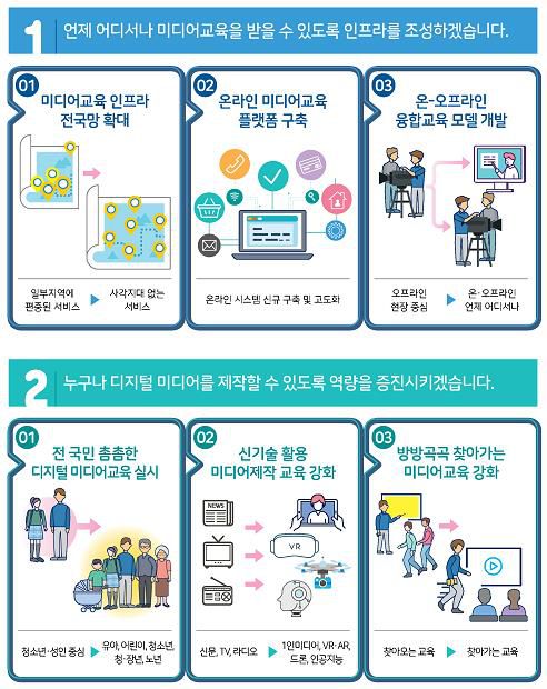 시청자미디어센터 등 미디어교육 거점시설의 전국 확대 구축을 추진하고, 누구나 미디어 제작과 체험을 할 수 있게 시설과 장비를 무상 지원한다. 미디어교육원을 교원연수 전문기관으로 육성하고, 학교미디어 교육센터를 신설해 원격수업이 본격화된 교육현장에 대한 지원을 강화한다. 흩어져 있던 미디어교육 관련 정보는 온라인 미디어교육 플랫폼에 모아 공유·개방한다.