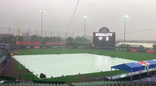 토론토 선의 롭 롱글리 기자는 오전 5시 무렵 "지금 버팔로 시내에 폭우가 내린다. 이리 호수의 바람과 함께 울부 짖는다"며 우천 취소 가능성이 높다고 전했다. 곧이어 세일런필드에도 폭우가 쏟아지고 있다.