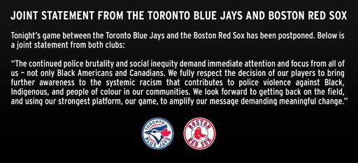 한국시간으로 28일 오전 7시37분 토론토와 보스턴의 경기가 열릴 예정이었지만, 이들 구단은 인종차별 반대를 위해 선수들이 내린 보이콧 결정을 받아들이기로 했다.