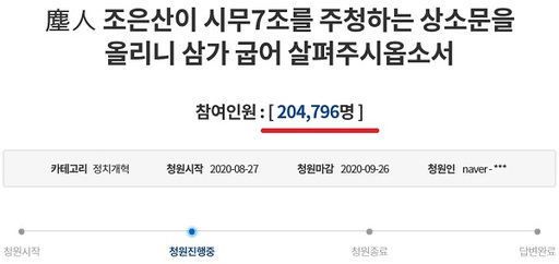 청와대 국민청원 게시판에 올라온 시무 7조 상소문이 청와대가 반드시 답변해야 하는 동의 인원 20만명을 넘긴 모습. 온라인 캡처 |
